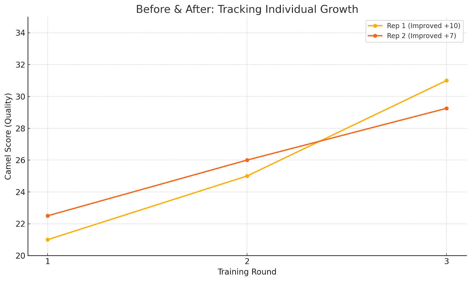 What we learned: These reps didn’t need rescuing, just repetition. By Round 4, they were handling consults like pros—with data to back it up. These were the safe bets that traditional shadowing might overlook.